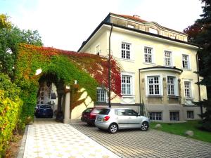 Der Haupteingang liegt am Ende einer herrschaftlichen Auffahrt mit insgesamt neun Stellplätzen, die einzeln zur separaten Anmietung stehen. Wenige Meter dahinter gibt es einen zweiten Nebeneingang.