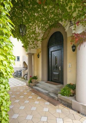 Der Haupteingang liegt am Ende einer herrschaftlichen Auffahrt mit insgesamt neun Stellplätzen, die einzeln zur separaten Anmietung stehen. Wenige Meter dahinter gibt es einen zweiten Nebeneingang.